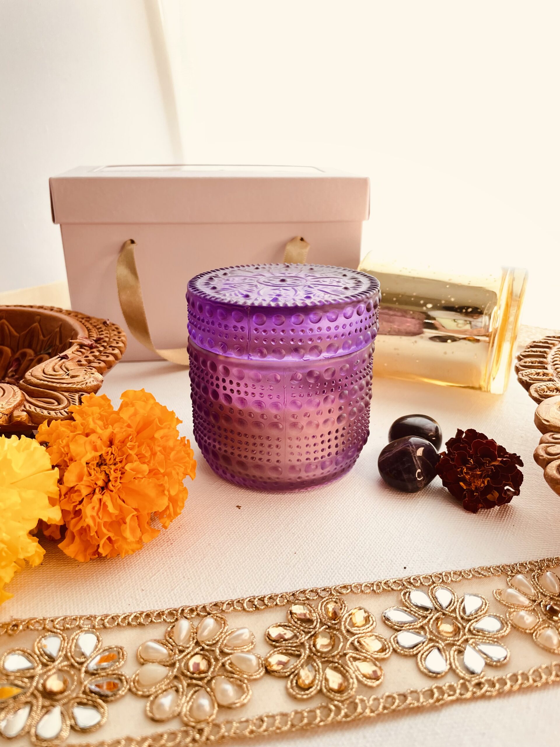 Purple color Aztec designer Candle infused with Lavender luminaire.