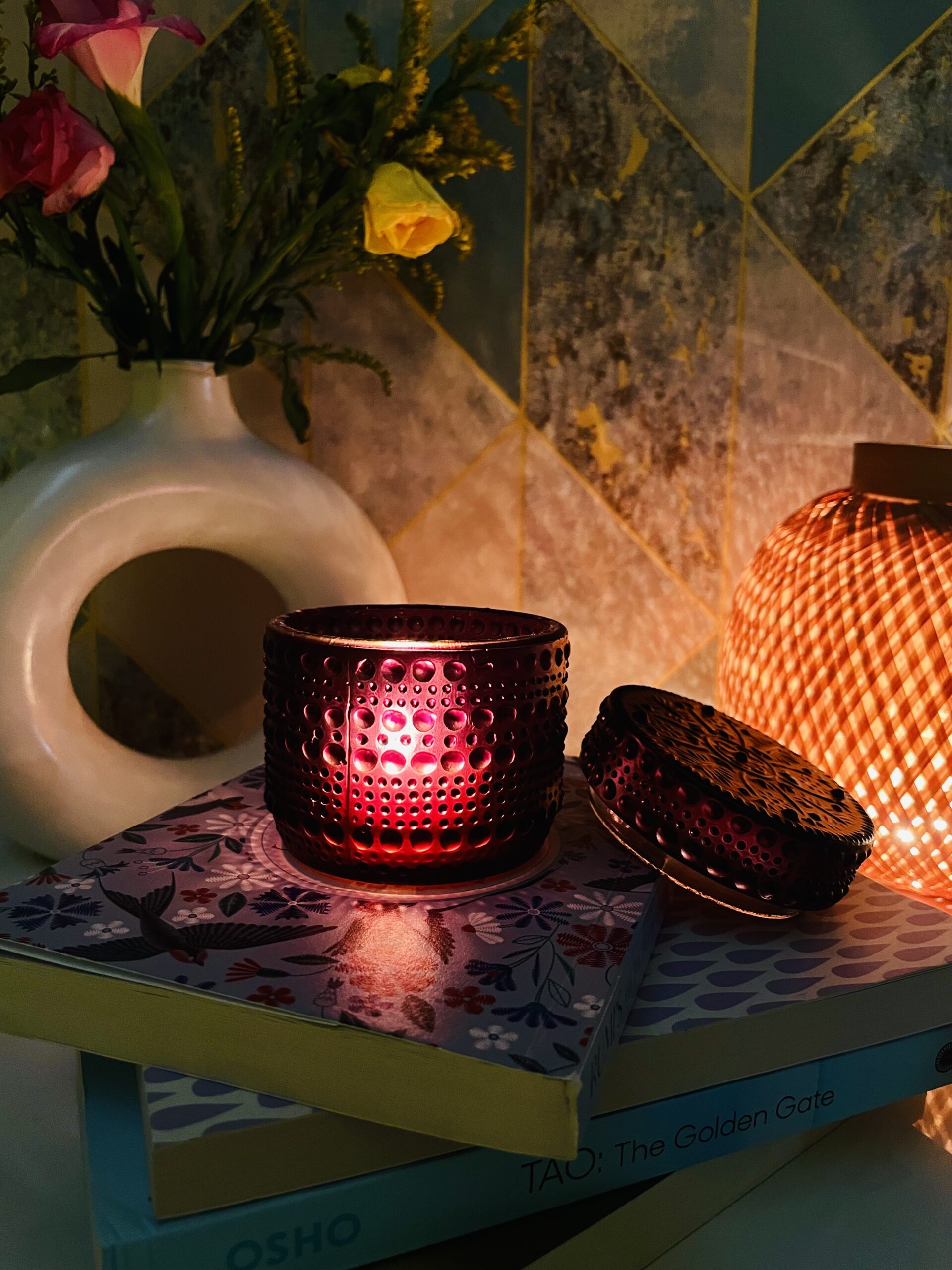 The black color designer glass candle is engraved with ancient Aztec pattern. This beautiful black color Aztec candle is infused with sensual aroma of Black opium.